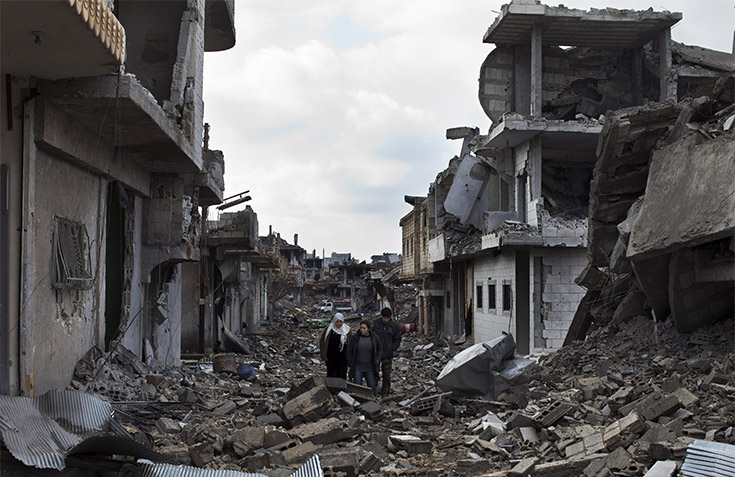 People walk amid the destruction in Kobane, Syria, after coalition forces clashed with ISIS. Phase one of Mao's doctrine of guerilla war is to begin action in an area of weak or unpopular governance (USA/Rex/Shutterstock)